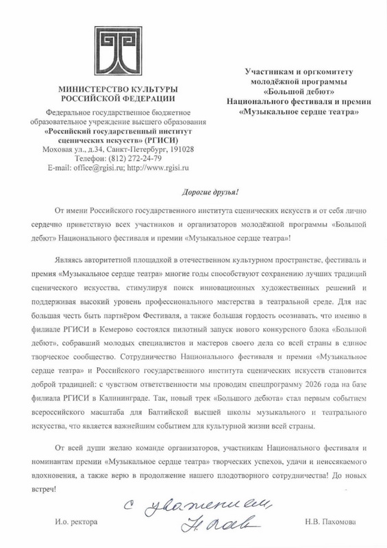 Коллектив Российского государственного института сценических искусств от всей души благодарит команду организаторов национального фестиваля и премии Музыкальное сердце театра за плодотворное сотрудничество и добрую дружбу! Сердечно поздравляем всех участников Фестиваля и лауреатов премии! До новых встреч!